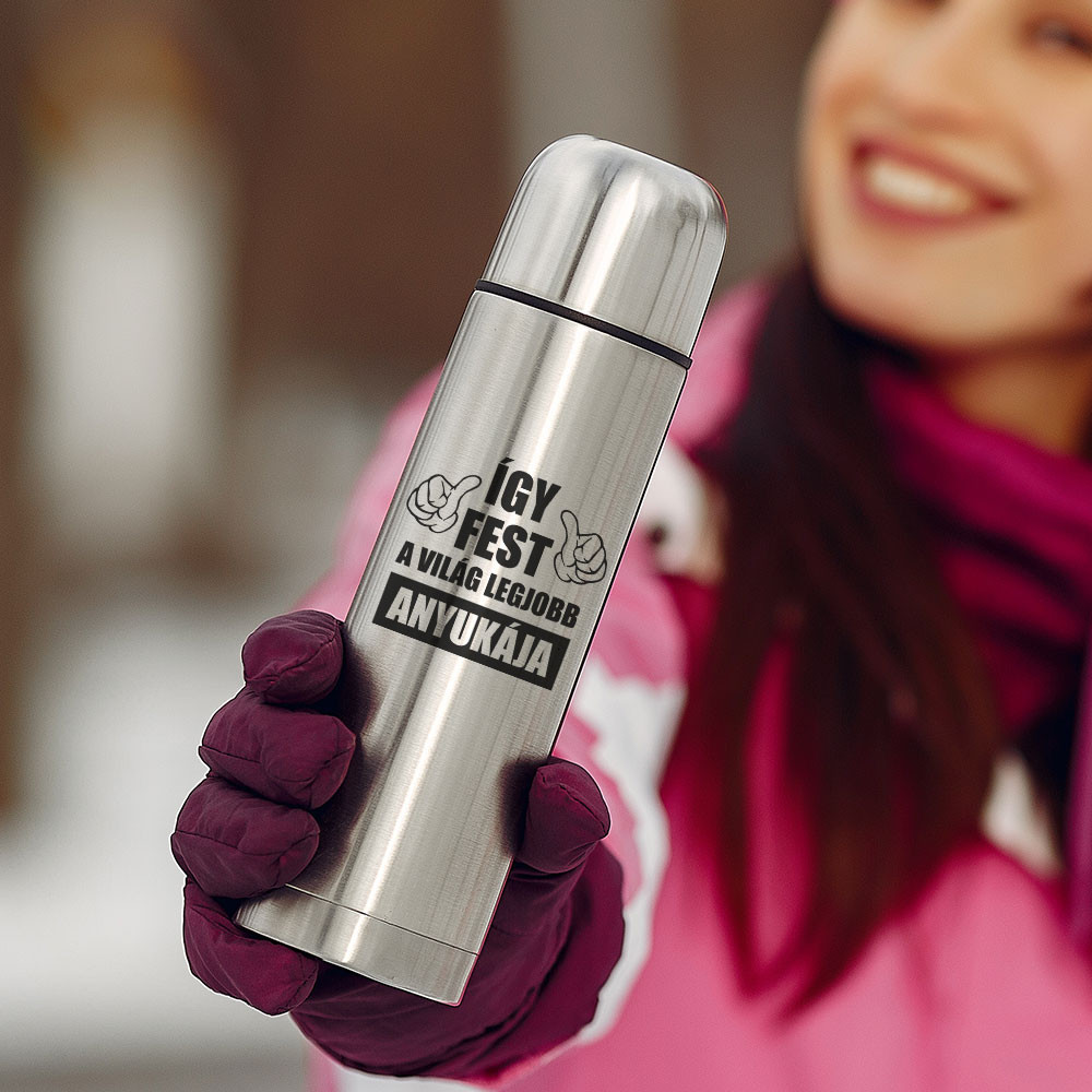 Termosz anyáknak, világ legjobb anyukája. Ajándék ötlet nőknek, termosz anyáknak. "Így fest a világ legjobb anyukája" felirattal.  Tökéletes ajándék édesanyáknak, akár anyák napjára is. Melegen vagy hidegen is tudja tartani az italokat. Űrtartalma: 500ml-es vagy 750ml-es.