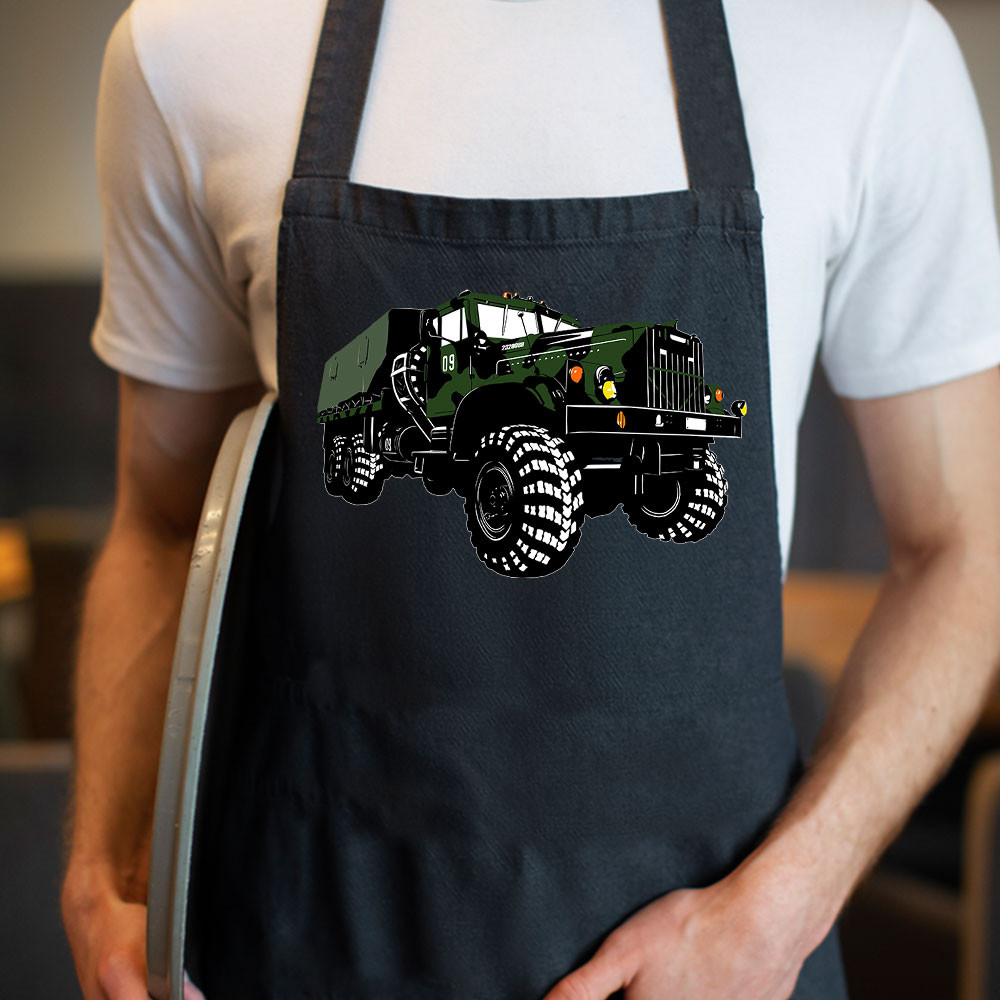 Terepjárós kötény, Kraz 255. Imádod a katonai járműveket, a durva terepet és a masszív gépszörnyeket? Akkor ez a katonai teherautós kötény neked készült! Egy igazi terepjáró ikon díszíti ezt a kötényt, amely tökéletes ajándék minden katonai rajongónak, veterán jármű gyűjtőnek vagy off-road fanatikusnak.