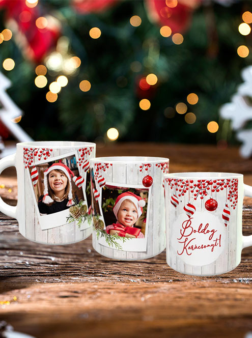 Egyedi karácsonyi ajándék, bögre 2 fotóval. Ajándék a szeretet ünnepére családtagoknak, barátoknak két fotóval, gyönyörű karácsonyi háttérrel. Ha biztosra szeretnél menni, egy ilyen bögrének mindenki örülni fog és közben egy praktikus használati tárgyat is ajéndékozol, amiről majd mindig Te jutsz eszébe. Rendelj mellé díszdobozt is!