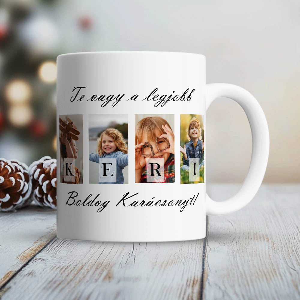 Megható és praktikus karácsonyi ajándék, amely minden nap emlékezteti a keresztanyát vagy keresztapát, mennyire fontos része a családnak. A „Te vagy a legjobb Keri” mintás bögre 4 saját fotóval készül, így minden korty egy kedves emlék lesz.
