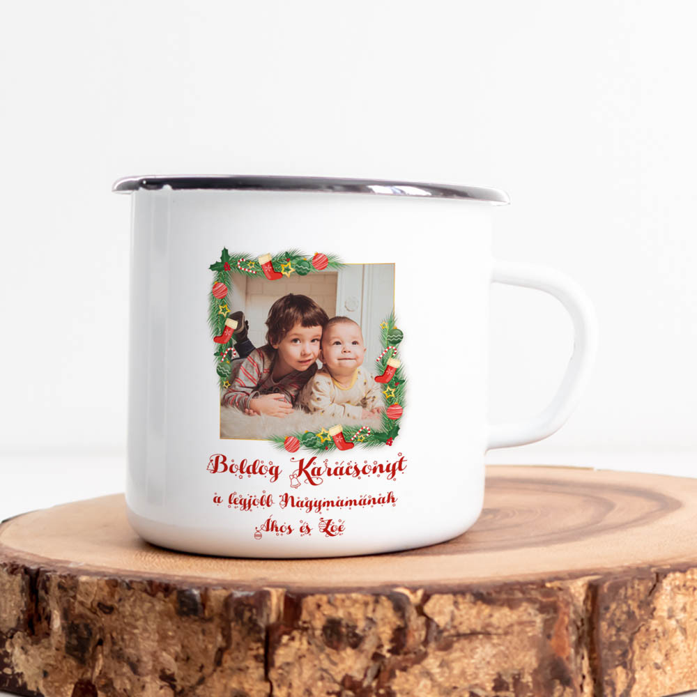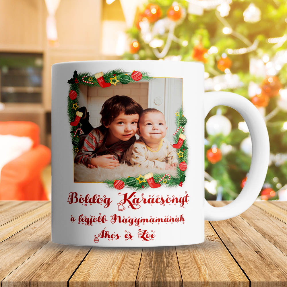 Karácsonyi bögre, ajándék nagymamának. Különleges egyedi ajándék nagyszülőnek saját fotóval és az unokák nevével. Kérd díszdobozban, válassz bögre színt, kosárba helyezés előtt írd be a nevet, neveket és tölts fel fotót. Kérjük maximum 3 nevet kérj a bögrére.