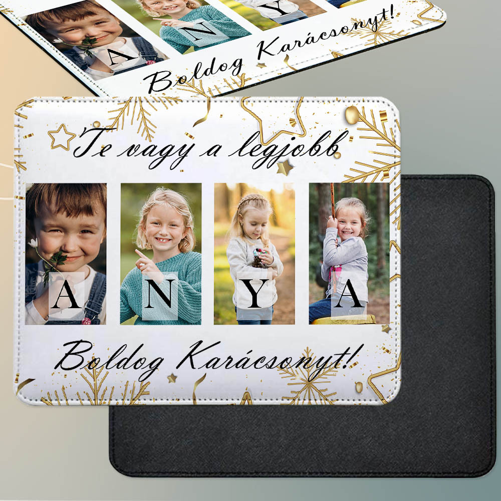 Kis méretű, mégis rendkívül személyes karácsonyi ajándék. A „Te vagy a legjobb Anya” mintával és 4 egyedi családi fotóval ellátott egérpad minden munkanapot kedvesebbé tesz. Csúszásmentes felületű, 22×18,5 cm-es méretben rendelhető.
