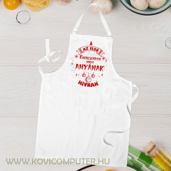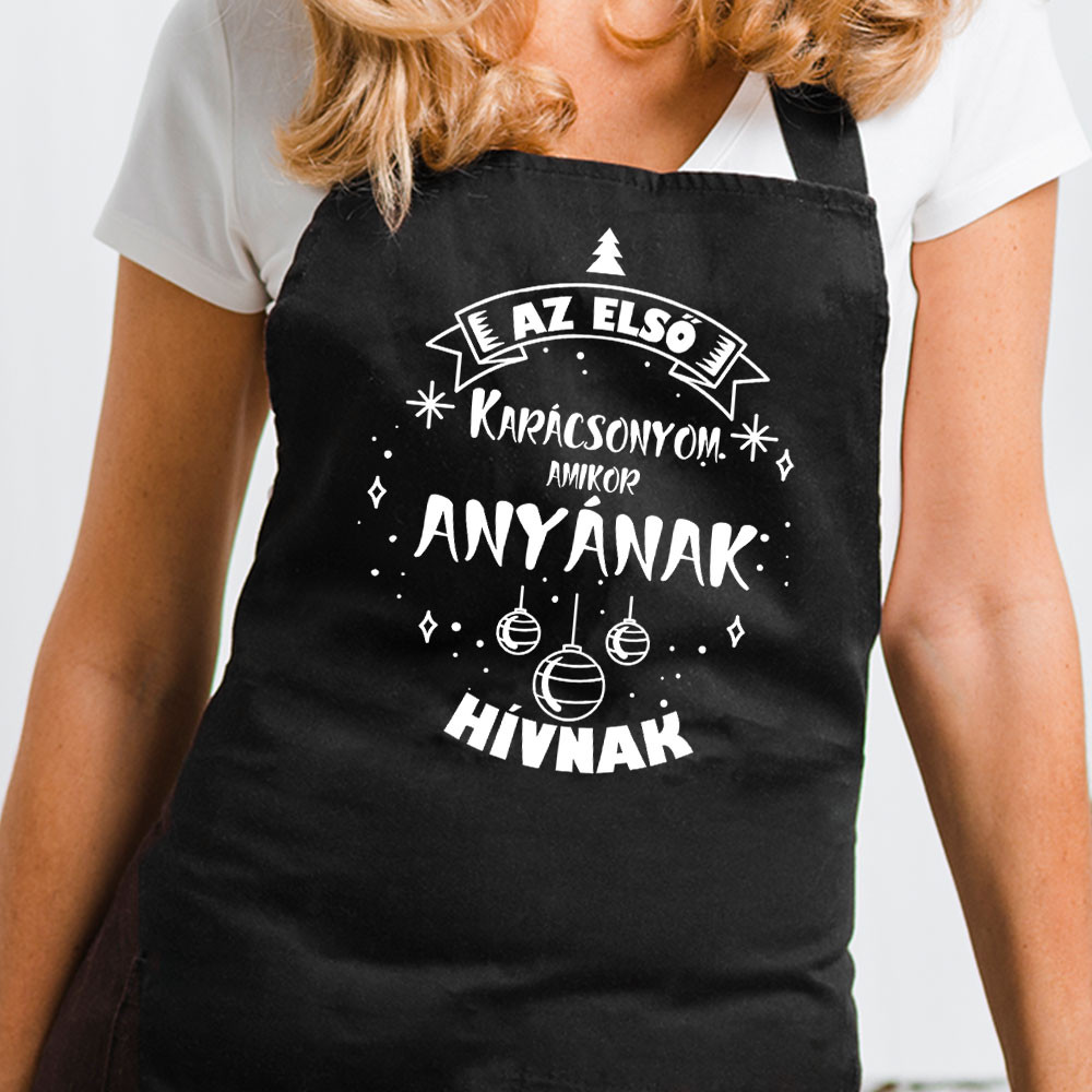 Karácsonyi ajándék szülőknek, kötény első anyukáknak. "Az első karácsonyom amikor anyának hívnak" felirattal. Újdonsült anyukáknak a legjobb meglepetés karácsonyra.