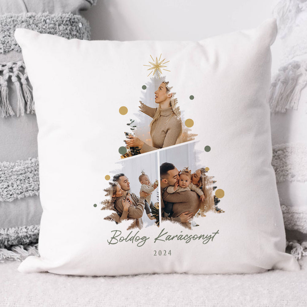 Fényképes párna, boldog karácsonyt. Kollázs fényképes párna karácsonyra szüleidnek, barátodnak, testvérednek az év legjobb pillanataival. Különleges ajándék a szeretet ünnepére akár nagyszüleidnek is. Egy meglepetés amiről bármikor eszébe jutsz, annak a személynek akinek szántad, mikor ránéz. Párna, melyen egy 3 fotóból álló kollázs fotóösszeállítás látható fenyő alakzatba, évszámmal és Boldog karácsonyt felirattal.