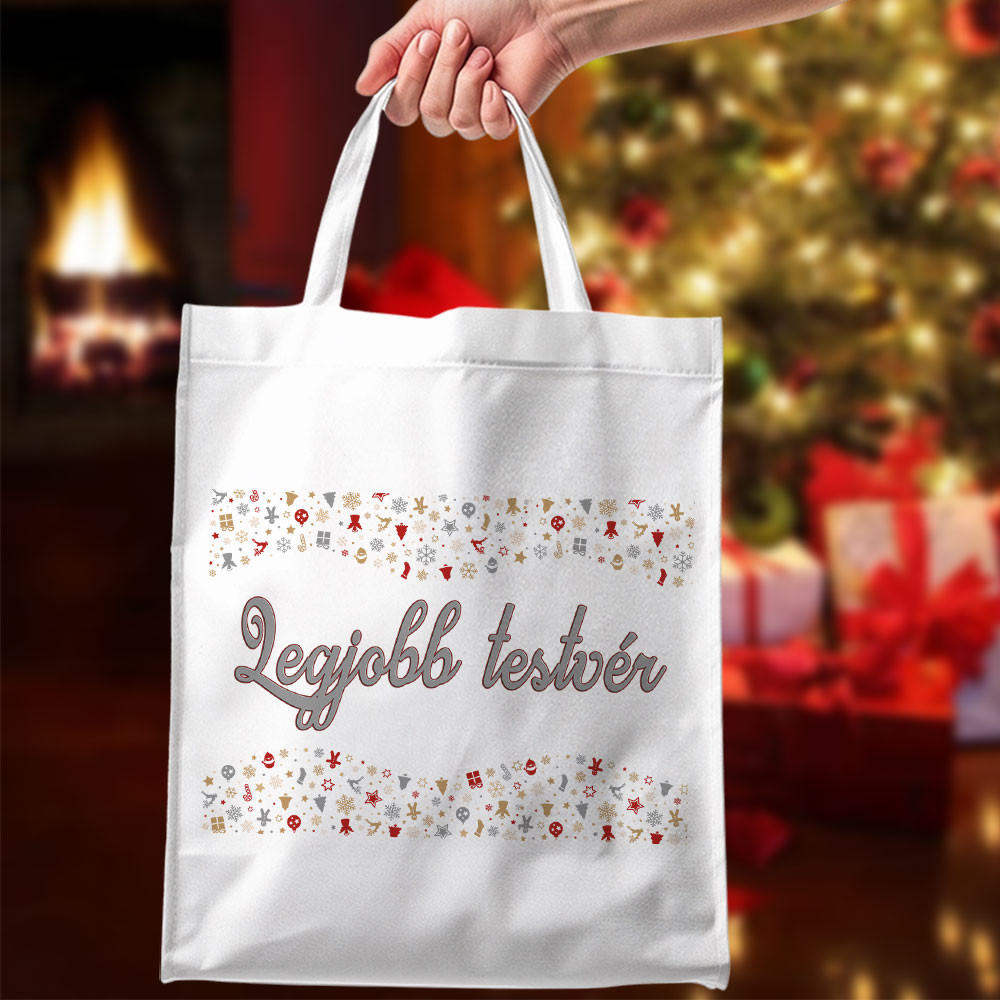 Karácsonyi ajándék, legjobb testvér táska. Téli mintákkal díszített legjobb testvér felirat. Ha a legjobb karácsonyi meglepetést keresed a legjobb testvérnek, ennek garantáltan örülni fog. Tartós mintával, örök emlék marad, amit használhatsz díszcsomagolásként is ajándékodhoz vagy bevásárlótáskának.
