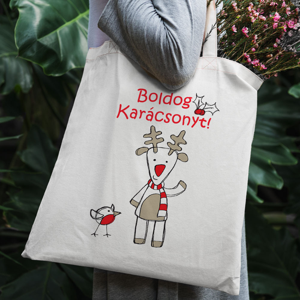 Karácsonyi ajándékok, rénszarvasos táska. Kívánj stílusosan Boldog Karácsonyt szeretteidnek ezzel a cuki rénszarvas mintás vászontáskával, amiben elhelyezheted karácsonyi ajándékod és a későbbiekben praktikus bevásálótáskának is használható. Mosógépben is mosható, a minta nem kopik le. A táska mérete 30x35 cm, a füle rövid.