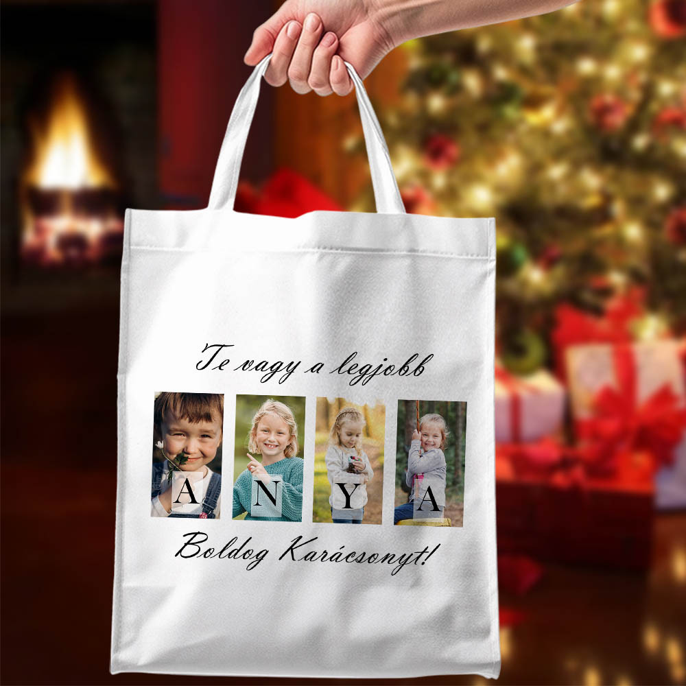 Egyedi, praktikus és megható karácsonyi ajándék. A „Te vagy a legjobb Anya” mintás vászontáskán 4 saját fotó kap helyet, így a mindennapi bevásárlás is személyes élménnyé válik. Tartós, fehér vászon anyagból készül, rövid füllel, kényelmes viseletként.