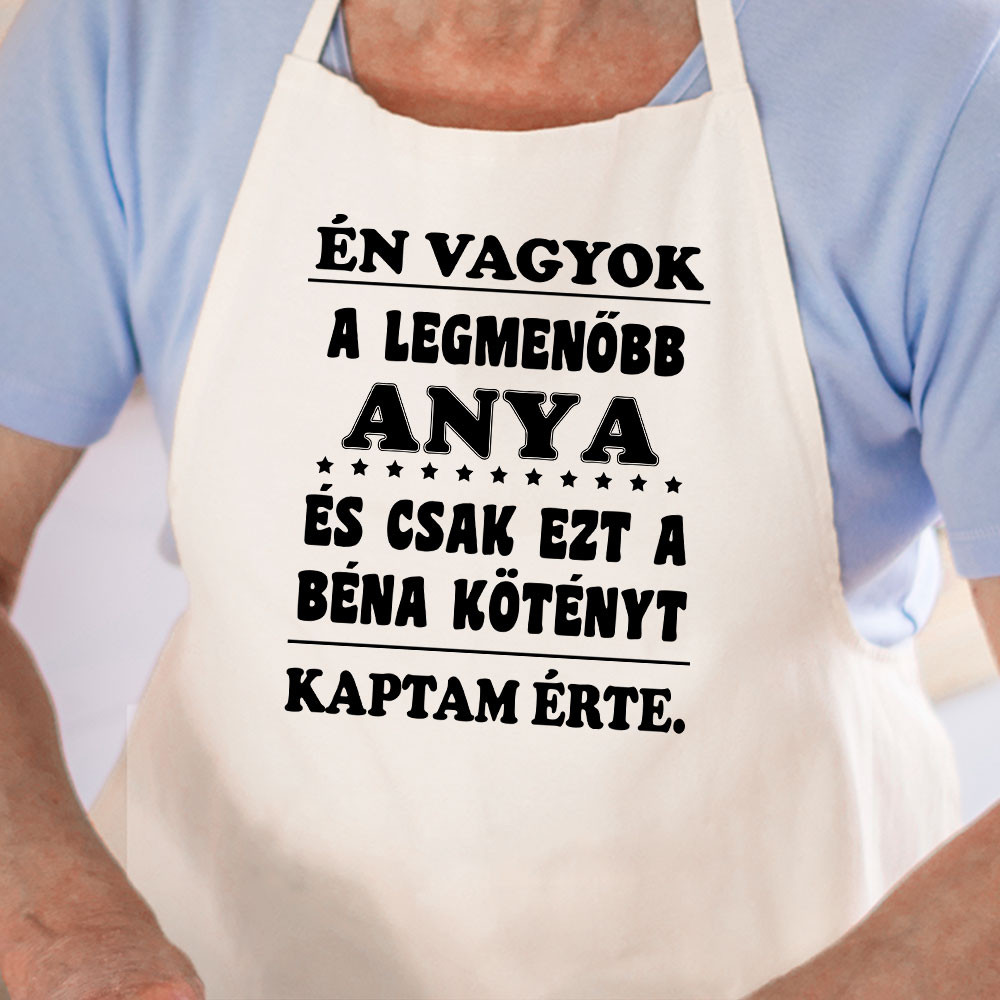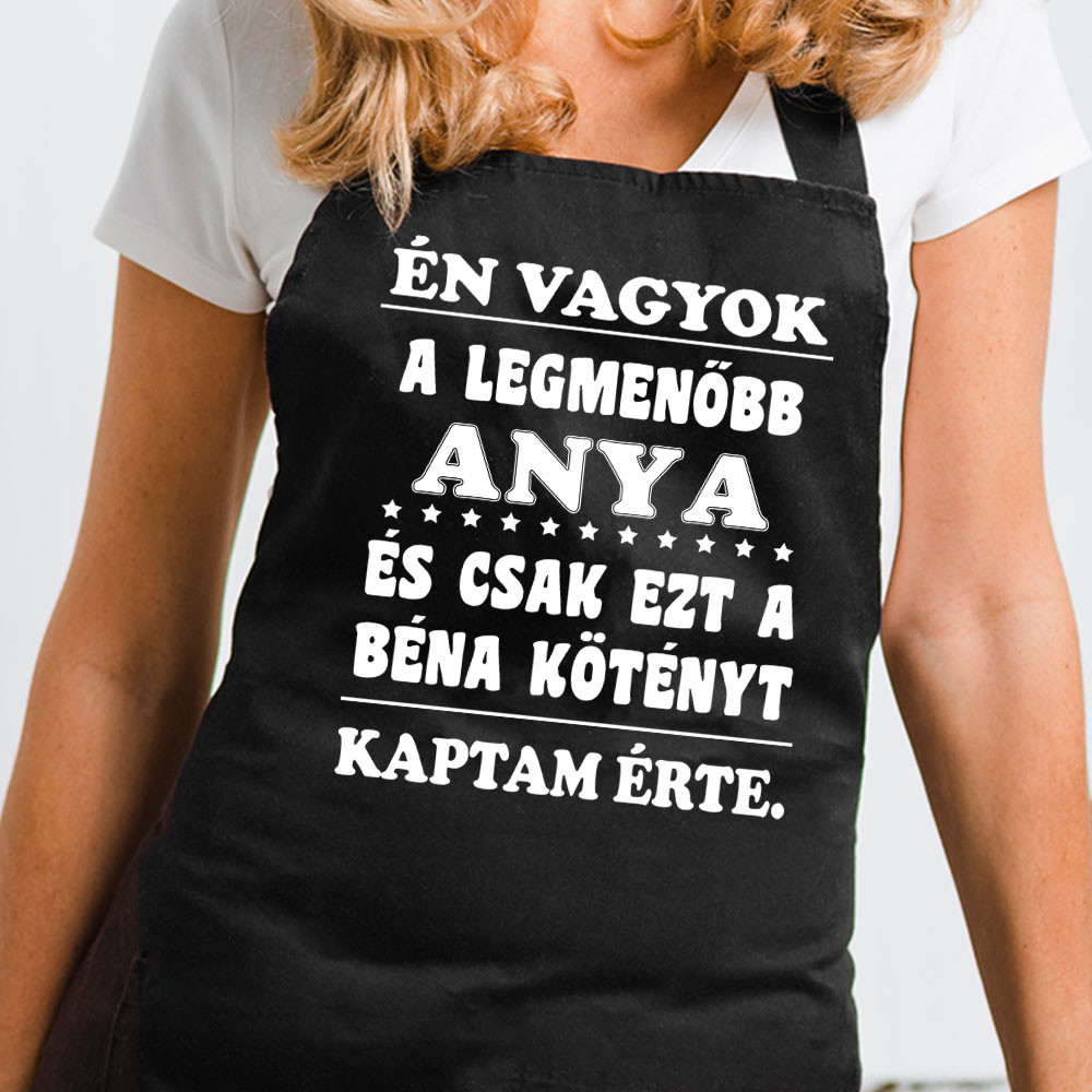 Ajándék anyának, vicces kötény édesanyáknak. "Én vagyok a legmenőbb anya, és csak ezt a béna kötényt kaptam érte." Tréfás feliratos kötény fekete vagy fehér színben anyukáknak névnapra, szülinapra, karácsonyra.