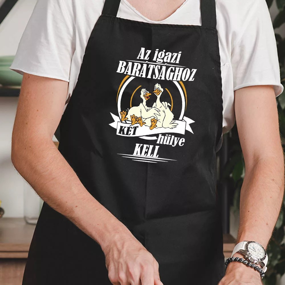 Vicces ajándék barátoknak, vicces kötény barátnőknek. Az igaz barátsághoz két hülye kell. Humoros feliratos kötény férfiaknak és nőknek, barátoknak és barátnőknek poénos grafikával, lepd meg vele te is legjobb barátodat, ha minden hülyeséget együtt csináltok. Vásárolj magadnak is egyet így tökéletes páros kötény lesz belőle számotokra.