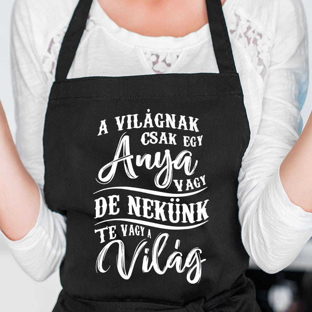 Kötény anyának, ajándék édesanyáknak. A világnak csak egy anya vagy, de nekünk Te vagy a világ felirattal. Népszerű ajándék anyák napjára, de bármilyen olyan alkalomra amikor anyukádat szeretnéd meglepni valami különleges ajándékkal. A kötény fekete színben is rendelhető.