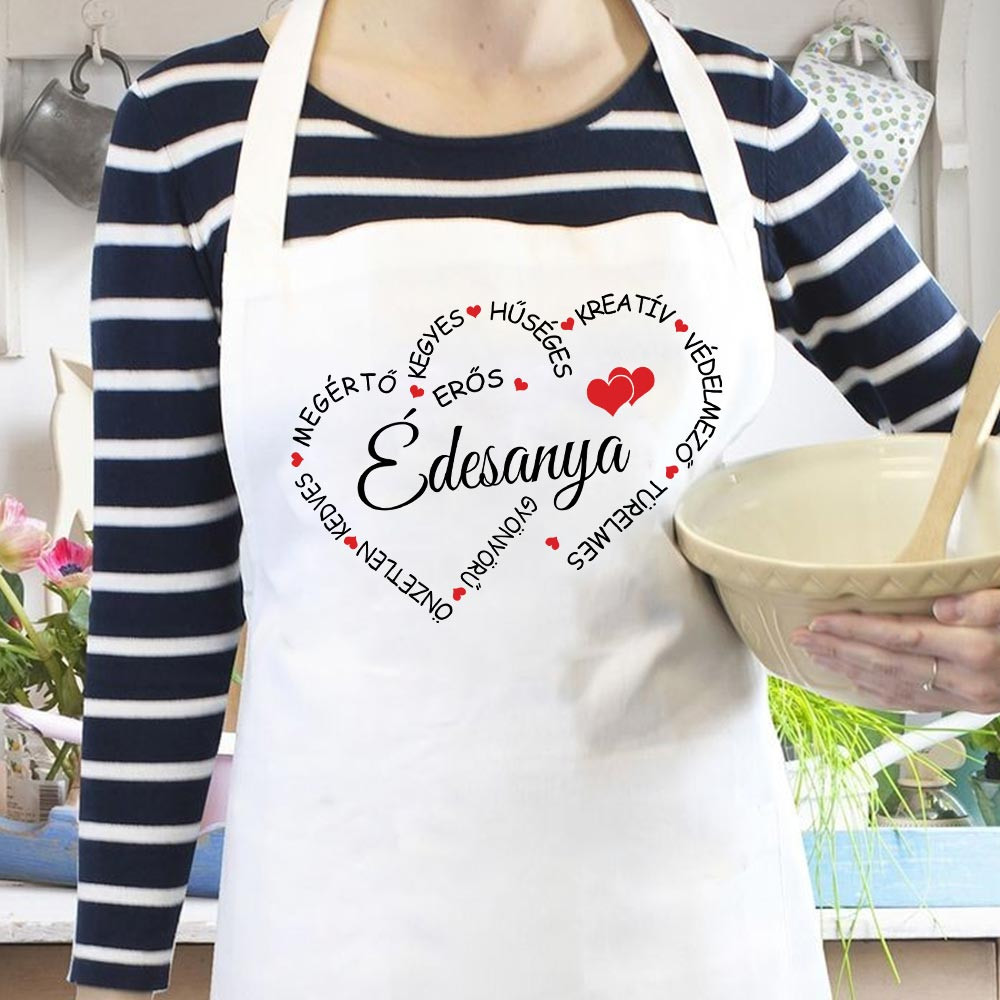 Feliratos kötény Édesanyának, anya jellemzői. Mutasd ki szeretetedet ezzel a gyönyörű Édesanya feliratos köténnyel! Egyedi szív alakú mintázata kedves szavakkal fejezi ki mindazt, ami egy édesanyát különlegessé tesz: megértő, kedves, erős, hűséges és gyönyörű...  Tökéletes ajándék minden anyukának, aki szívvel-lélekkel főz szeretteinek.