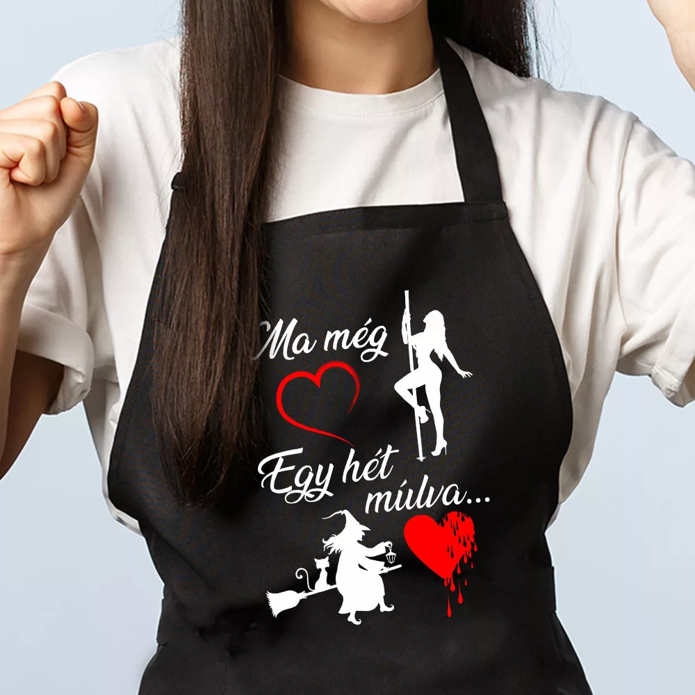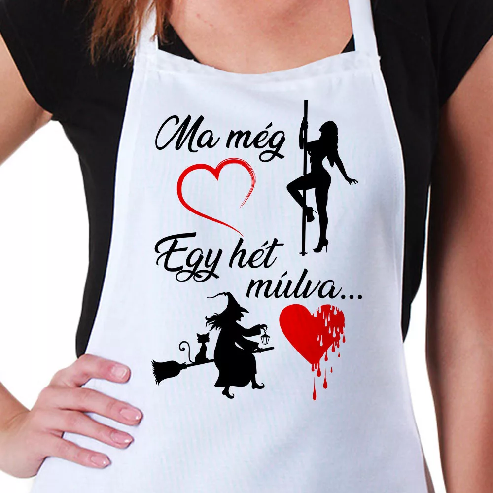 Kötény lánybúcsúra, ajándék menyasszonynak lánybúcsúra. Ma még bulizik, egy hét múlva már boszorkány. Ajándék minden nőnek aki szeret főzni, ebben a vicces kötényben stílusosan búcsúztathatja a szingli éveket.