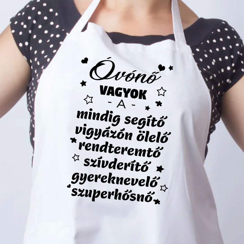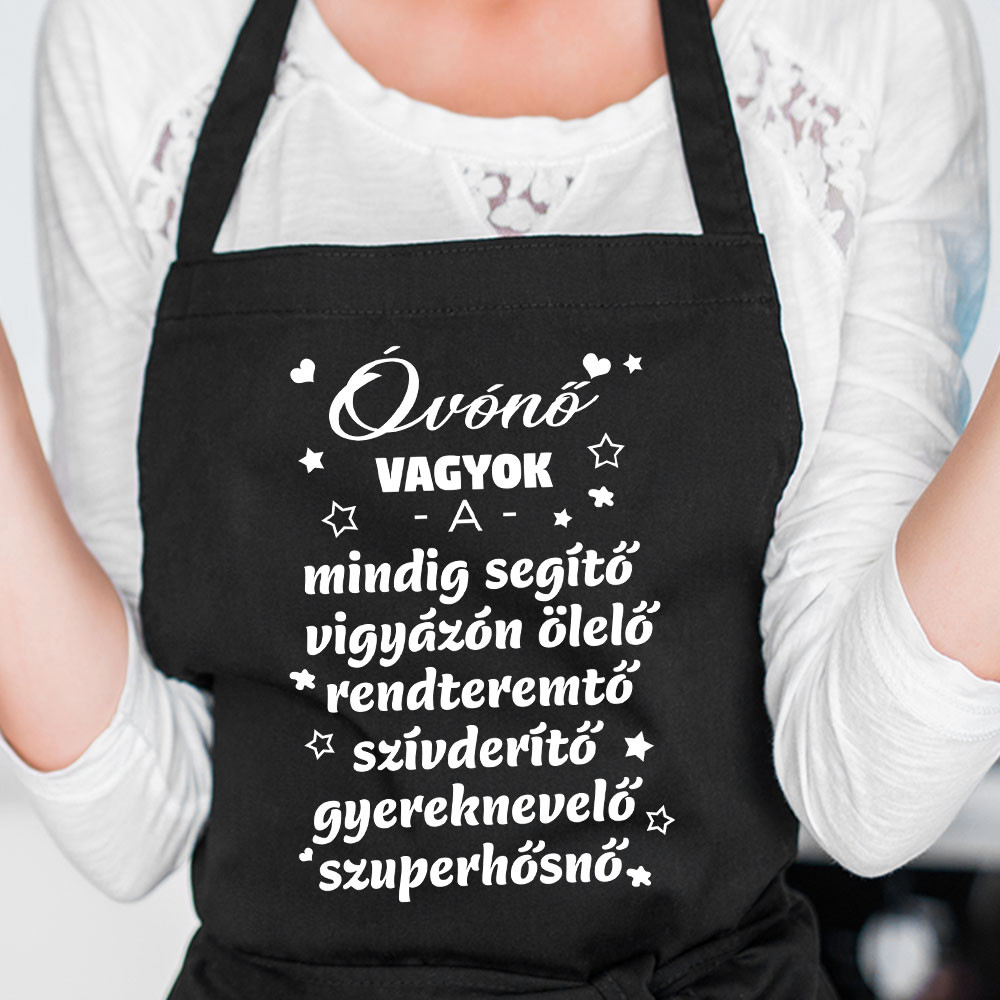 Ajándék óvónéninek, óvónő vagyok kötény. A mindig segítő, vigyázón ölelő, rendteremtő, szívderítő, gyereknevelő, szuperhősnő feliratos kötény, ami bármely óvónéninek kiváló ajándék lehet ballagásra, születésnapra. Fekete színben is rendelhető, vászon kötény a leggondoskodóbb óvónőnek.