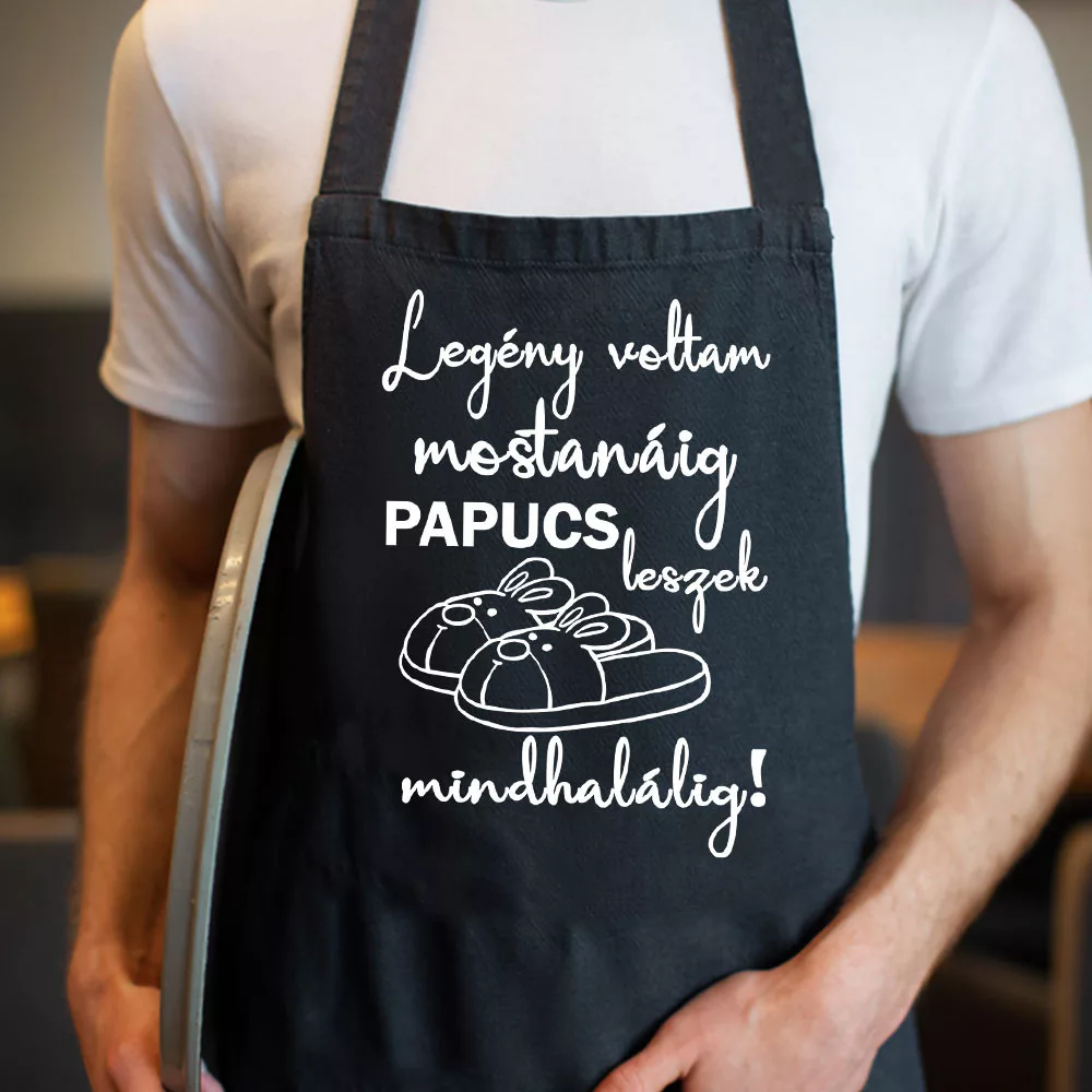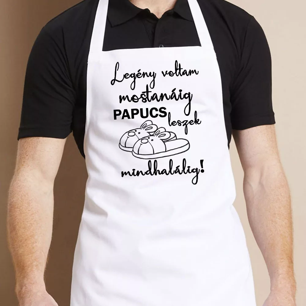 Ajándék vőlegénynek, kötény nősülő férfiaknak. Vicces kötény házasulandó szakácsoknak, vagy főzni szerető férfinak. Felirat: Legény voltam mostanáig, papucs leszek mindhalálig. A kötényt fekete színben, fehér mintával is rendelheted.