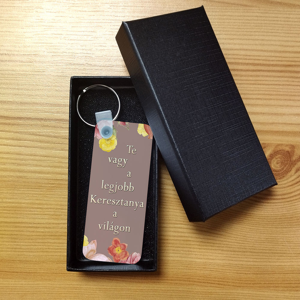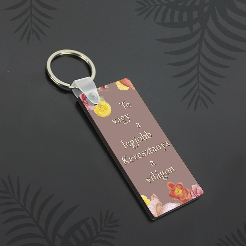 Legjobb keresztanya a világon kulcstartó. Egyedi, virágmintás kulcstartó, amely tökéletes ajándék keresztanyáknak, hogy kifejezd háládat és szeretetedet. A kulcstartó finom virágdíszítéssel rendelkezik, amely tökéletes ajándék minden alkalomra.