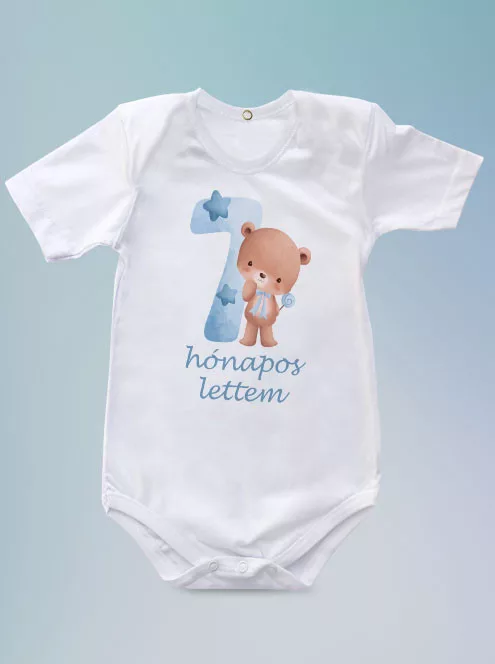 Baba ajándék, macis body kisfiúknak, 7 hónapos lettem body. Medvés body minden 7 hónapos baba ruhatárából kihagyhatatlan!