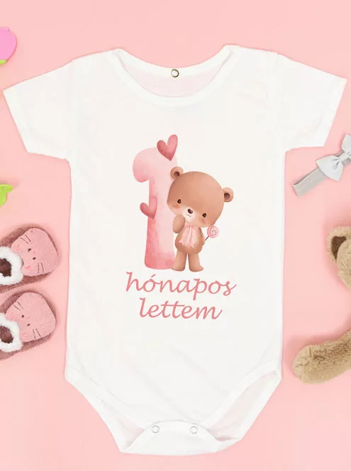 Baba ajándék, macis body kislánynak. Tedd emlékezetessé a kisbabád első hónapját ezzel az aranyos, szívvel díszített macis bodyval! A "1 hónapos lettem" feliratú darab tökéletes egyedi ajándék babalátogatásra vagy havi fotózáshoz. Kiváló minőségű, fehér, rövid ujjú, 100% pamut baba body, patentos kivitelben. Tökéletes választás, ha feliratos ajándékot keresel, ami egyszerre meglepetés és örök emlék.