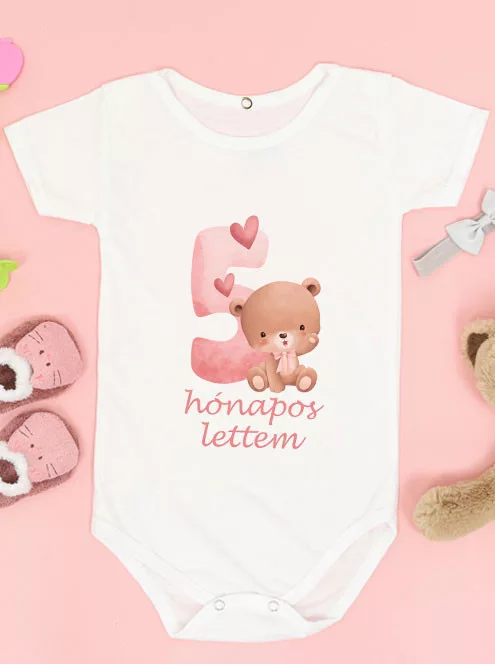 Baba ajándék, macis body kislánynak, 5 hónapos lettem body. A fél évhez közeledve egyre fontosabbak az emlékek! Ez a feliratos body tökéletes választás, ha kreatív és személyes ajándékot keresel. 100% pamutból készült, kényelmes viselet, és garantáltan mosolyt csal mindenki arcára.