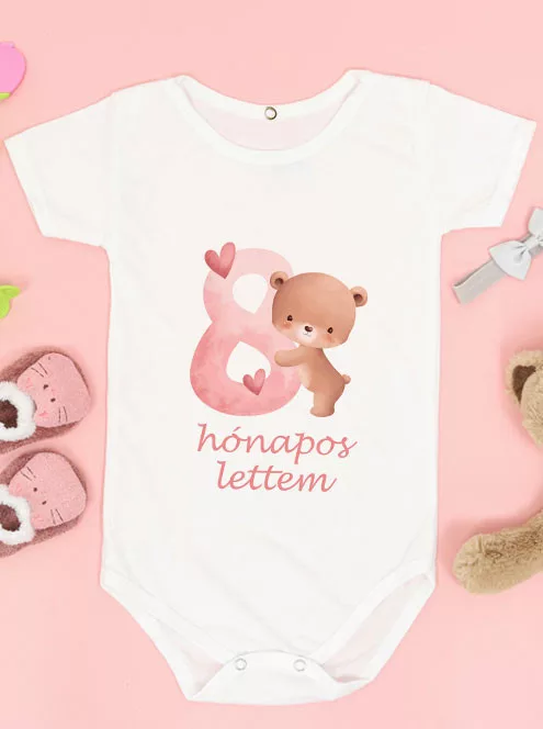 Baba ajándék, macis body kislánynak, 8 hónapos lettem body. A babafotók sztárja lehet ez a bájos, egyedi ajándék. A kis maci és a szívecskék igazán szerethető megjelenést kölcsönöznek ennek a kényelmes, 100% pamut bodynak. Tökéletes meglepetés bármelyik hónapfordulóra.
