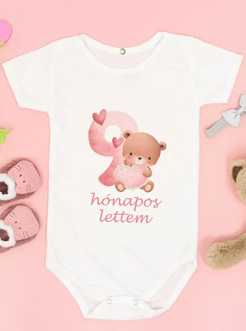Baba ajándék, macis body kislánynak, 9 hónapos lettem body. A kilenc hónap örömét koronázd meg egy különleges feliratos bodyval! Egyedi ajándék szülőknek, keresztszülőknek vagy nagyszülőknek – akár saját használatra, akár meglepetésként. A praktikus patentos kialakítás megkönnyíti az öltöztetést.