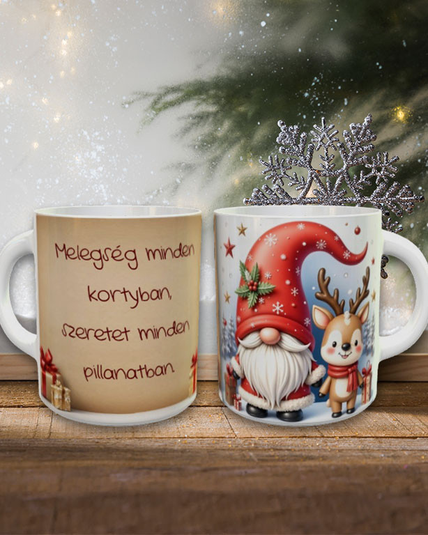 Karácsonyi manós bögre idézettel. Melegség minden kortyban, szeretet minden pillanatban feliratos bögre, aranyos rénszarvas és manó mintával, mindenki szívébe belopja magát. Köszöntsd karácsony alkalmával egy ilyen bögrével szeretteidet. Rendelj mellé díszdobozt is!
