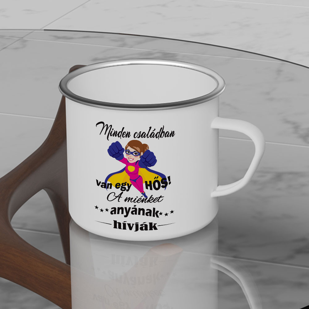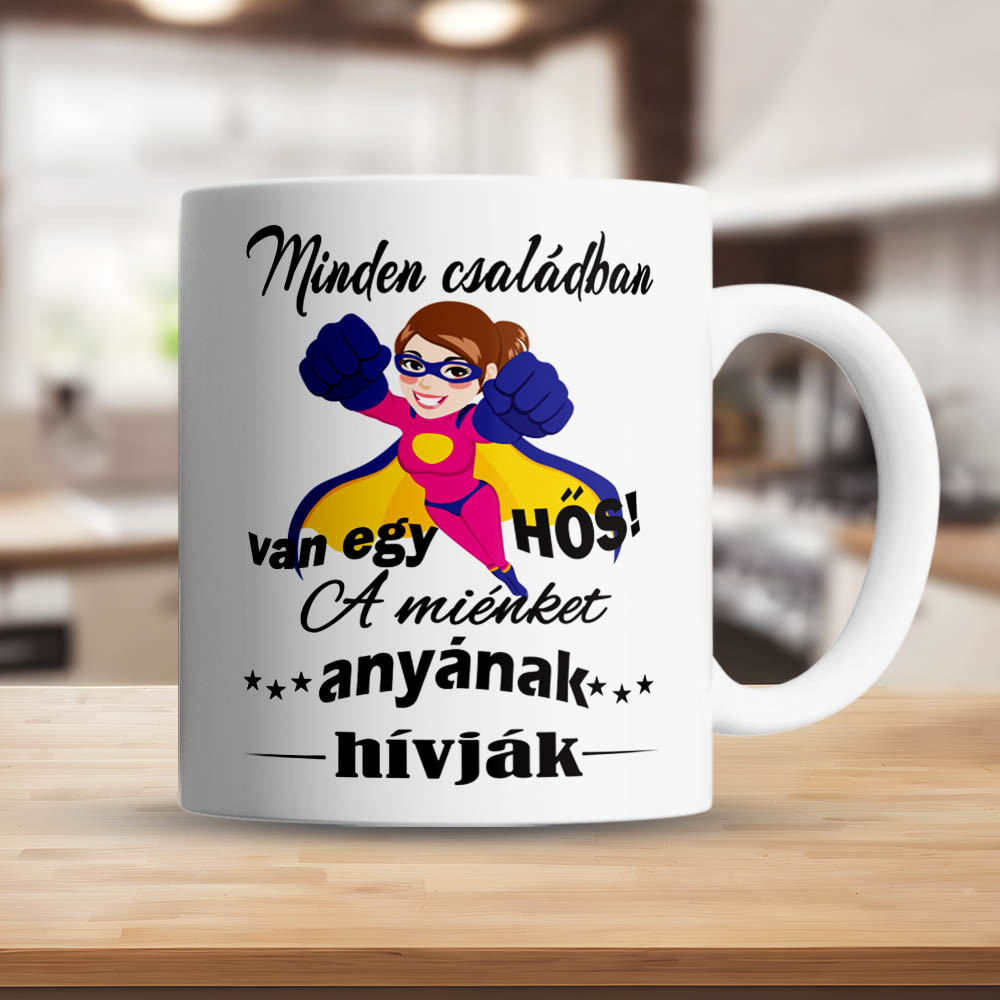 Feliratos bögre anyának, egy hős anya. Minden családban van egy hős a miénket anyának hívják bögre egy igazi szuperhős anyukának ajándék anyák napjára. Ha Ti családotokoban is anya a hős akkor válaszd neki szülinapjára ezt a feliratos szuperanya grafikás bögrét.