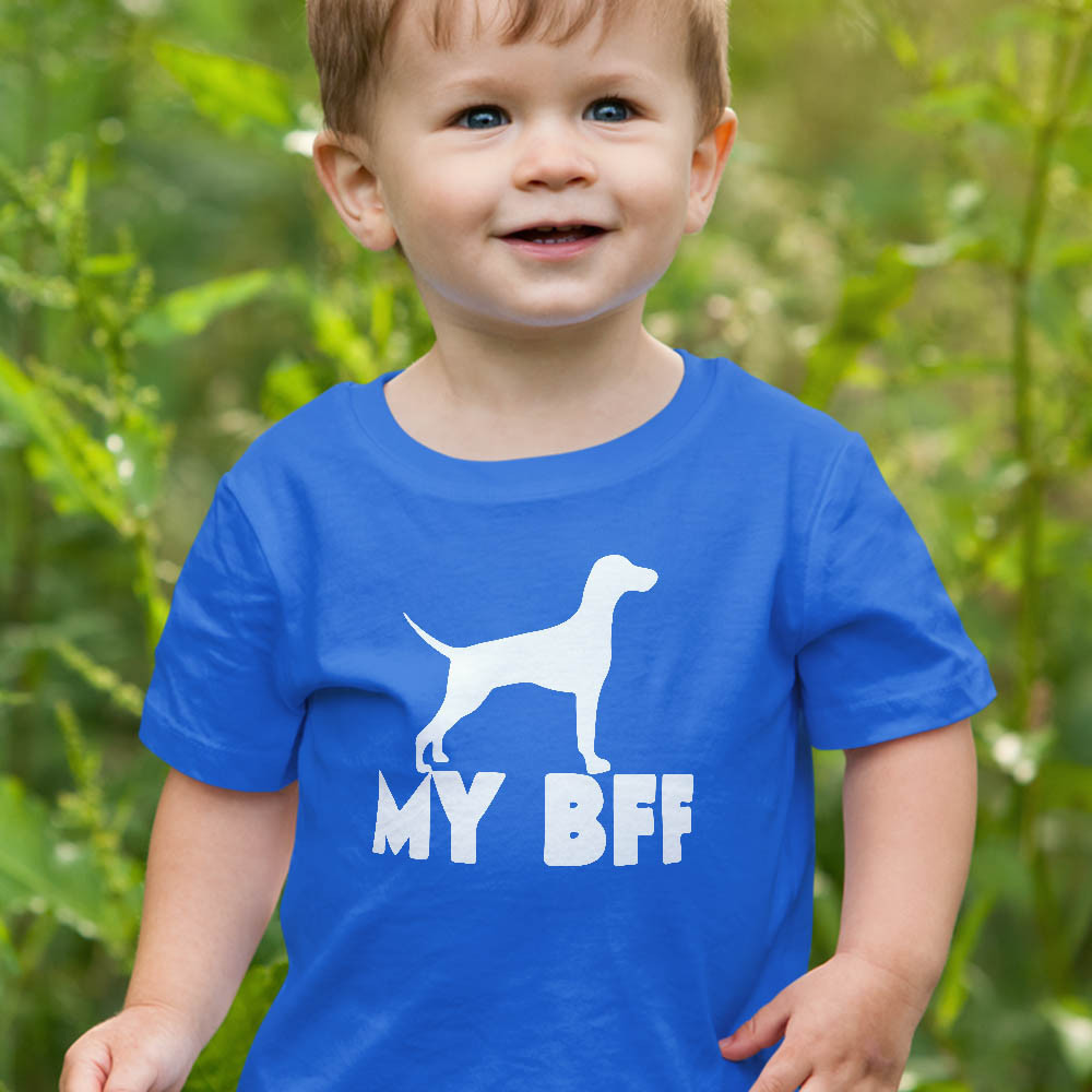 Kutyás meglepetés, My BFF gyerek póló. Ajándék olyan gyereknek, akinek a kutyája a legjobb barátja is egyben. Lepd meg őt egy választható színű pamut gyerek pólóval.