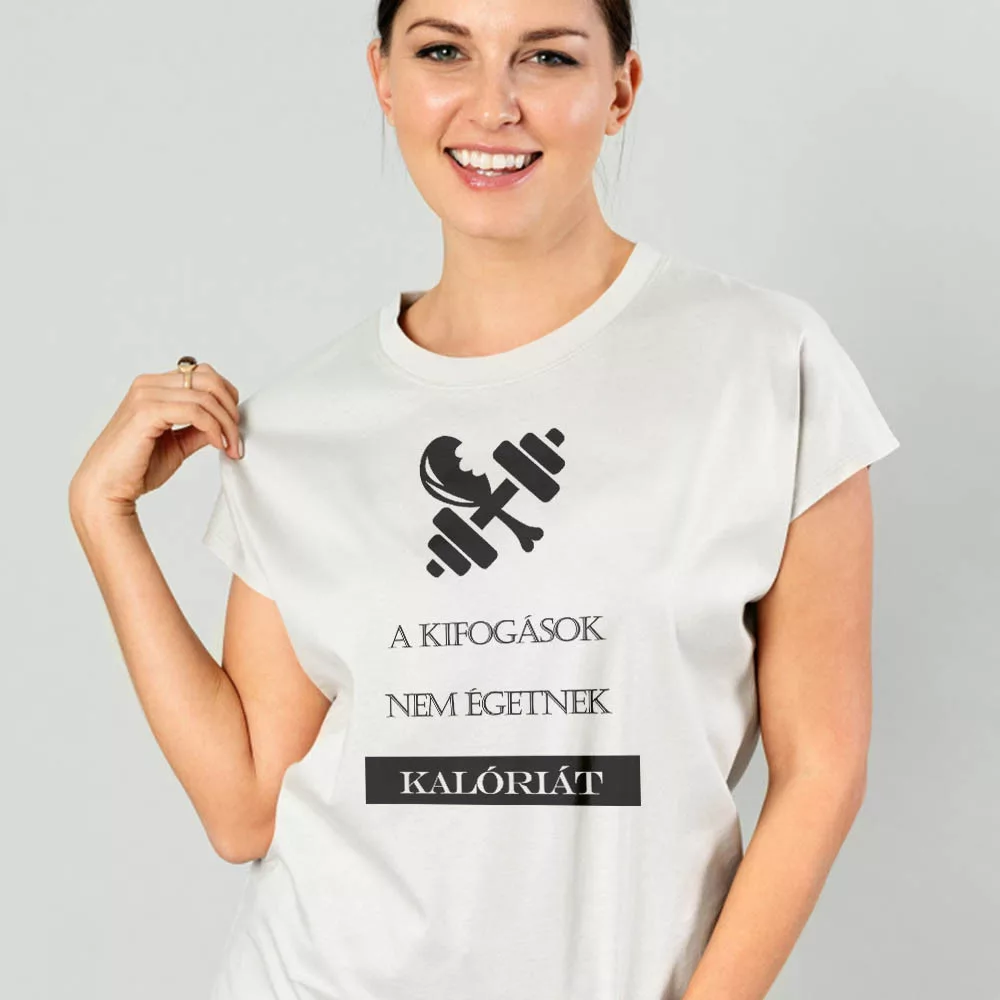 Női póló edzőknek, motivációs ajándék. A kifogások nem égetnek kalóriát feliratos póló nőknek, akik szabadidejük nagy részét az edzőteremben töltik. Ajándékozd meg edződet, aki még akkor is kitartott melletted, amikor Te már majdnem feladtad. Pamut póló többféle színben, minden méretben.
