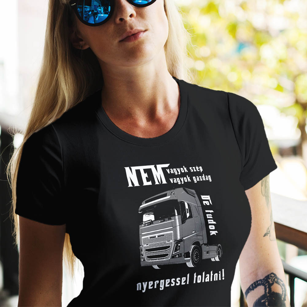 Kamionos női póló, nyergessel tolatni. Ajándék kamionosoknak, női póló nyomtatás az alábbi felirattal: "Nem  vagyok szép, gazdag de tudok nyergessel tolatni!" Tökéletes ajándék születésnapra, névnapra.