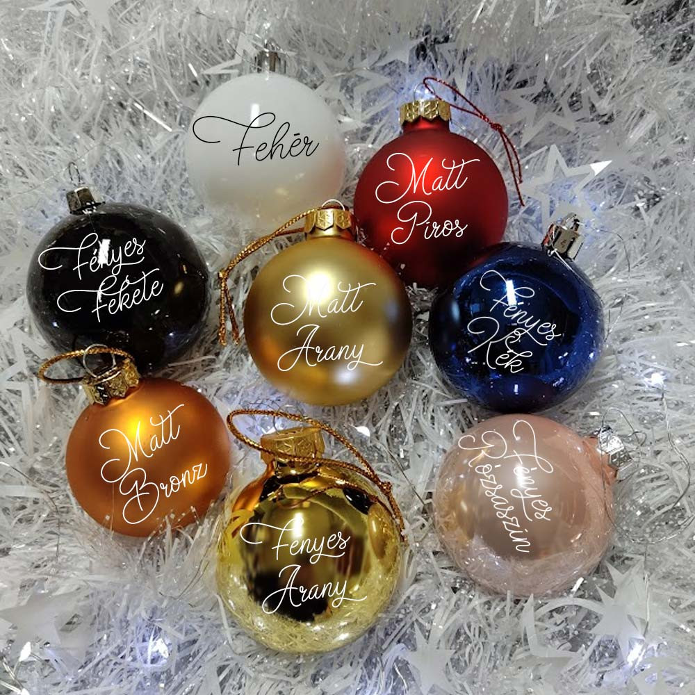 Saját neves karácsonyfadísz. A gömbökön apró festékhiba/karcolás található. Gömb alakú dísz karácsonyra saját névvel. A gömb átmérője 6 cm (kicsi) és 8 cm (nagy) akasztózsinórral szállítjuk. Egyedi, különleges ajándék karácsonyra a család minden tagjának. Kitűnő ajándékötlet nagyszülőknek és a család minden tagjának. Többféle színben elérhető dísz fenyőre.