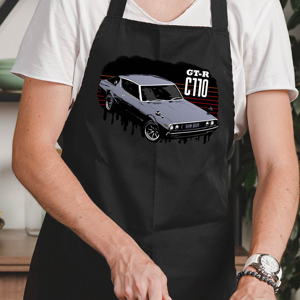 Retro autós kötények, Nissan GT-R C110. Egy igazi Oldtimer autó rajongó vagy, esetleg ismersz olyan embert akinek a kedvenc kocsija egy Nissan GT-R C110, bármelyikről is legyen szó egy ilyen kötény amin kedvenc autóját láthatja valaki, mindig tökéletes ajándék lesz egy férfi vagy nő számára. Válassz mellé egy hozzá illő bögrét vagy párnát is!