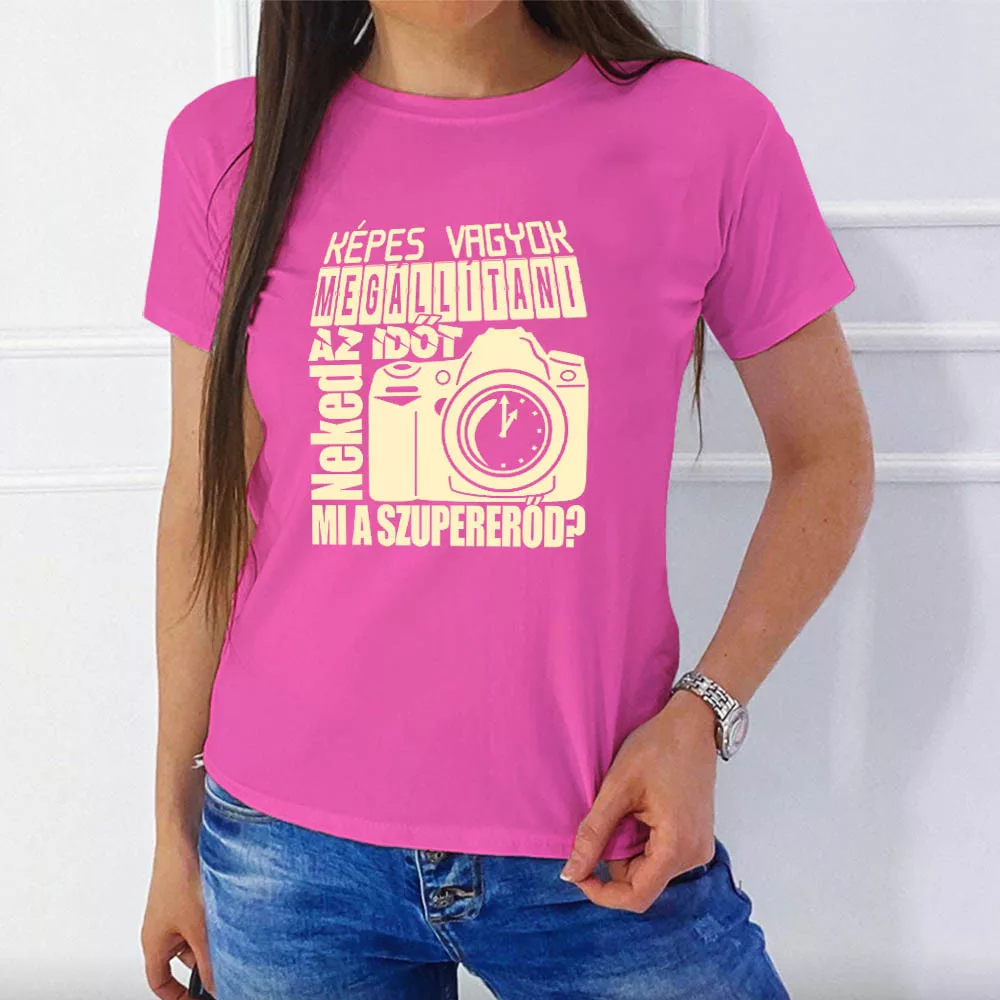 Ajándék fotósoknak, mi a szupererőd női póló. Képes vagyok megállítani az időt, neked mi a szupererőd? felirattal ellátott női póló ami semelyik fotós ruhatárából sem hiányozhat. Ajándéknak tökéletes választás egy fotósnak aki a legcsodálatosabb képeket tudja készíteni. Lepd meg vele családtagod, barátnőd, ismerősöd.