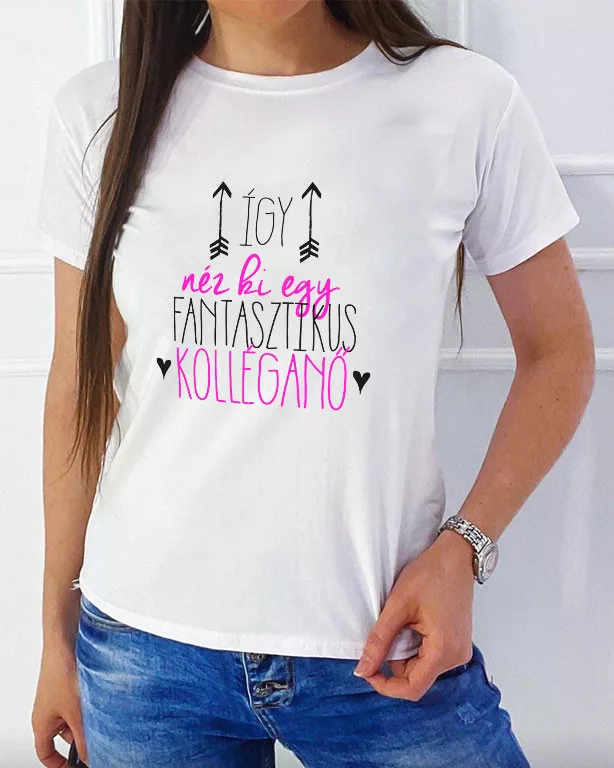 Ajándék kollégának, női póló kolléganőnek. Vicces póló női munkatársnak, "Így néz ki egy fantasztikus kolléganő" felirattal. Most akciós áron, már csak 1 db van készleten.