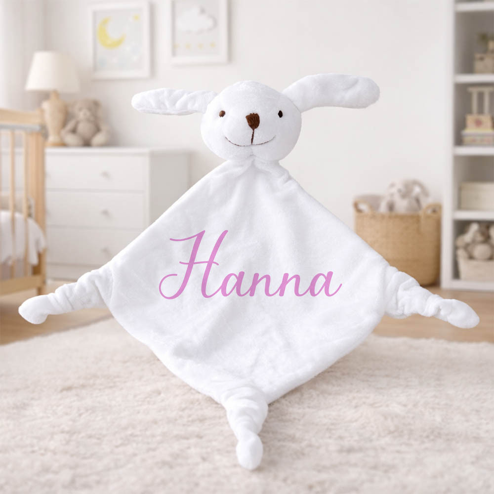 Aranyos nyuszifejes kendő segít a megnyugtatásban és biztonságérzetet nyújt minden elalváshoz. Kérhető egyedi névvel, választható feliratszínnel - így tökéletes személyes ajándék babalátogatóra vagy keresztelőre.