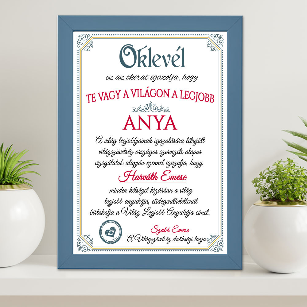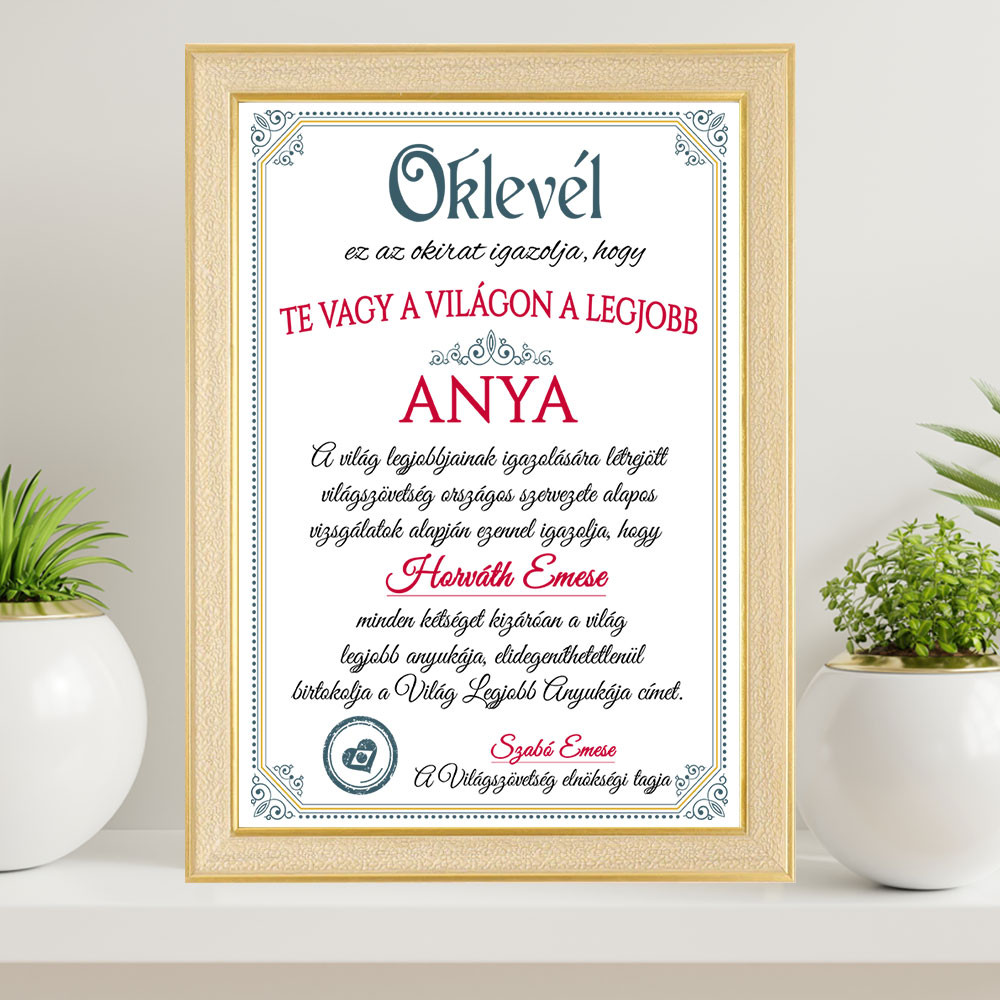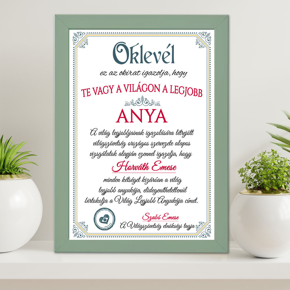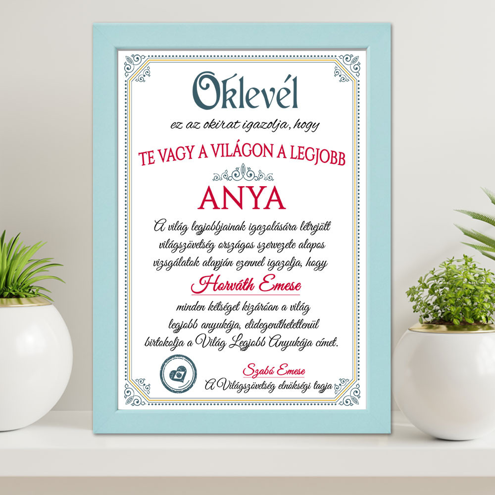 Anyák napi oklevél, falikép édesanyáknak, ami egy Oklevelet tartalmaz a Világ legjobb anyukájának. Köszöntsd édesanyádat anyák napján, születésnapján, vagy karácsonykor egy névre szóló okirattal.