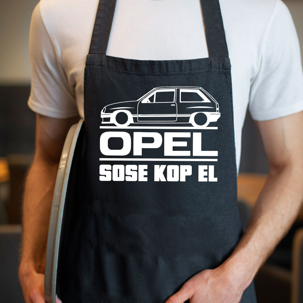 Opeles kötény, Opel sose kop el kötény. Ha egyetértesz azzal, hogy az Opel sose kop el és csakis az Opel márkára esküszöl, rendelj magadnak egy ilyen kötényt, amivel össze tudsz öltözni kedvenc autóddal. A kötény fekete és fehér színben is választható. Mérete 66x78 cm, anyaga vászon.