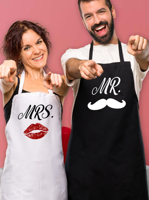 Mrs Mr kötény, bajusz és csókos száj. Kötény Valentin napra, születésnapra, karácsonyra neked és szerelmednek. Egy igazi klasszikus bajusz és csókos száj mintás kötény, páros ajándék pároknak. Vászon kötény amit együtt viselhettek majd főzés közben.