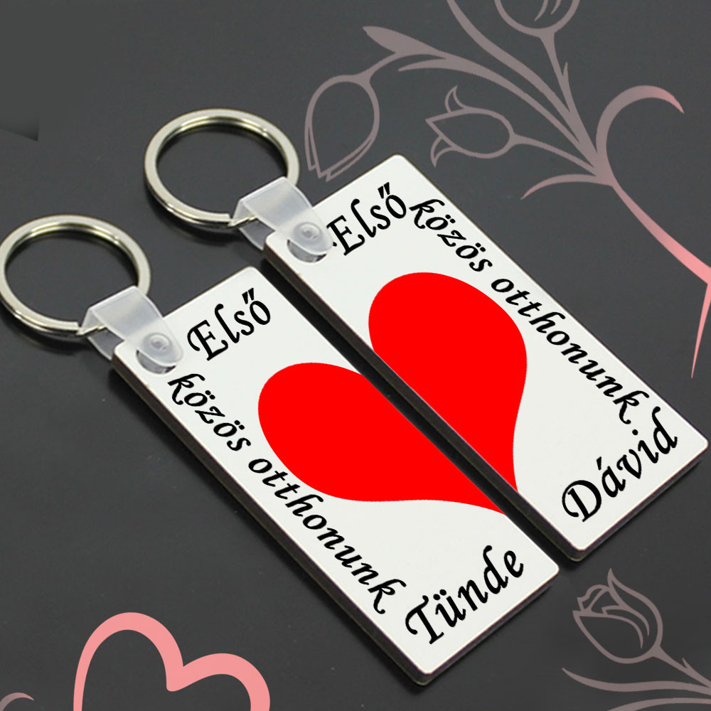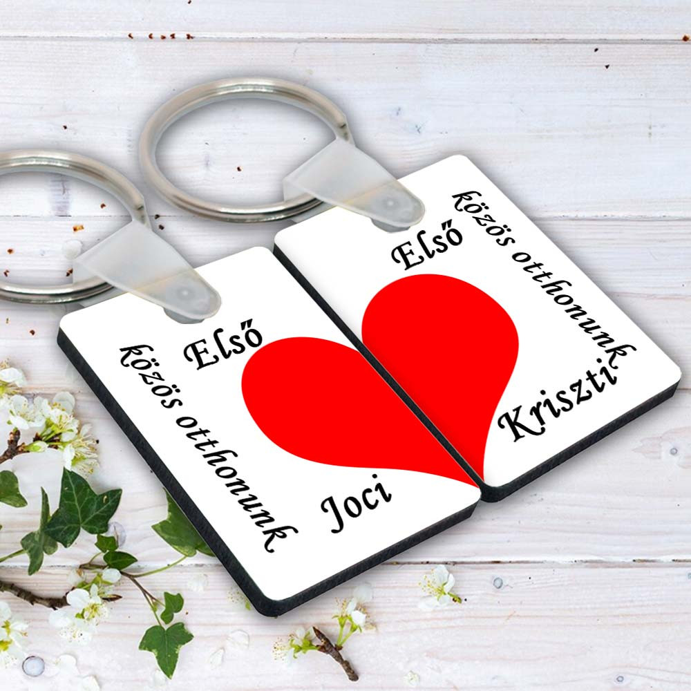 Páros kulcstartó saját nevekkel, első közös otthon felirattal. Az első otthon nagy mérföldkő, összeköltözni valakivel, aki számodra a legkedvesebb nagy esemény az életedben. Lepd meg magatokat egy névre szóló páros kulcstartóval. Anyaga: MDF fa, mérete: 7x3 cm