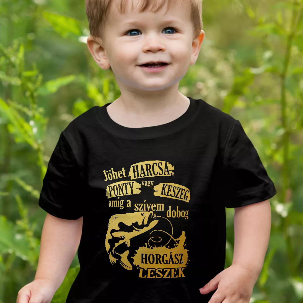 Jöhet harcsa, ponty vagy keszeg, amíg a szívem dobog horgász leszek gyerek póló legnépszerűbb mintáink egyikével, ami eddig minden kis horgász tetszését elnyerte. Ha ajándékot keresel pecás rokonodnak, barátodnak, ismerősödnek ez lesz a legjobb választás. Most akciósan csak 1 darab kapható.