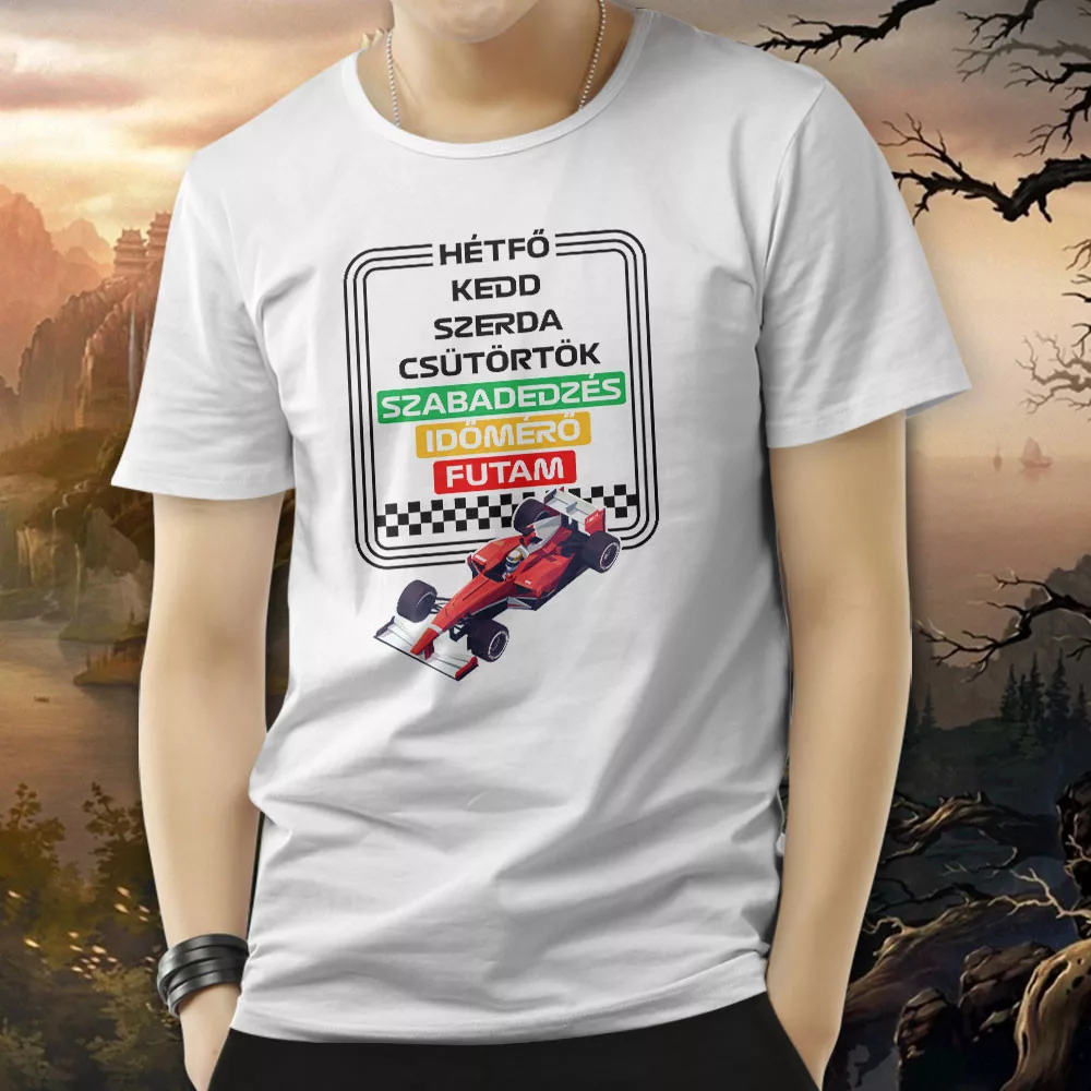 Ideális ajándék autórajongóknak, Forma–1 kedvelőknek, születésnapra, névnapra vagy bármilyen különleges alkalomra. A póló nemcsak egy ruhadarab, hanem egy életérzés kifejezése, amely megmutatja, hogy a hét napjai bizony a verseny körül forognak.