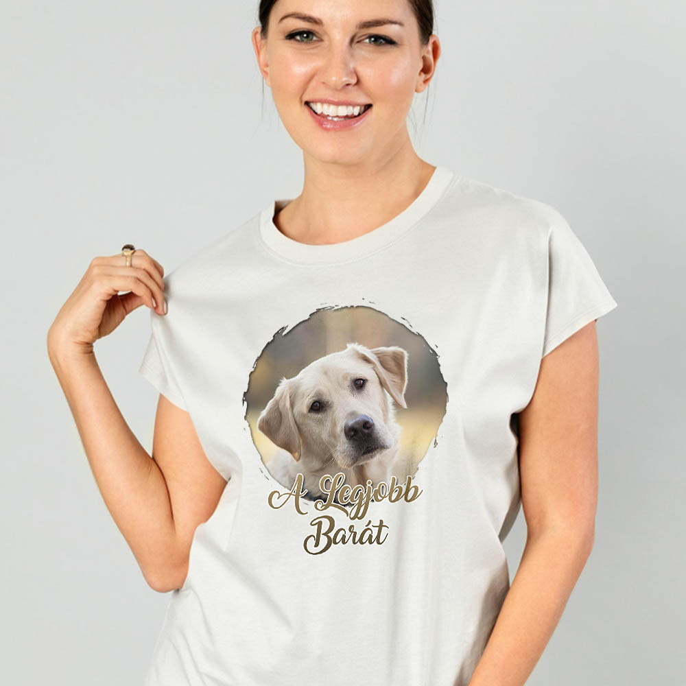 Fényképes kutyás női póló, legjobb barát.  Egyedi, állatbarátoknak készült női póló, amely tökéletes ajándék kutyatulajdonosoknak vagy bárkinek, aki szereti a hűséges négylábú társakat. A pólóra kerülhet házikedvenced képe vagy a kedvenc közös képetek is. „A Legjobb Barát” felirat kiemeli a kutyák hűségét és szeretetét, így ez a póló különleges ajándék lehet minden gazdi számára.