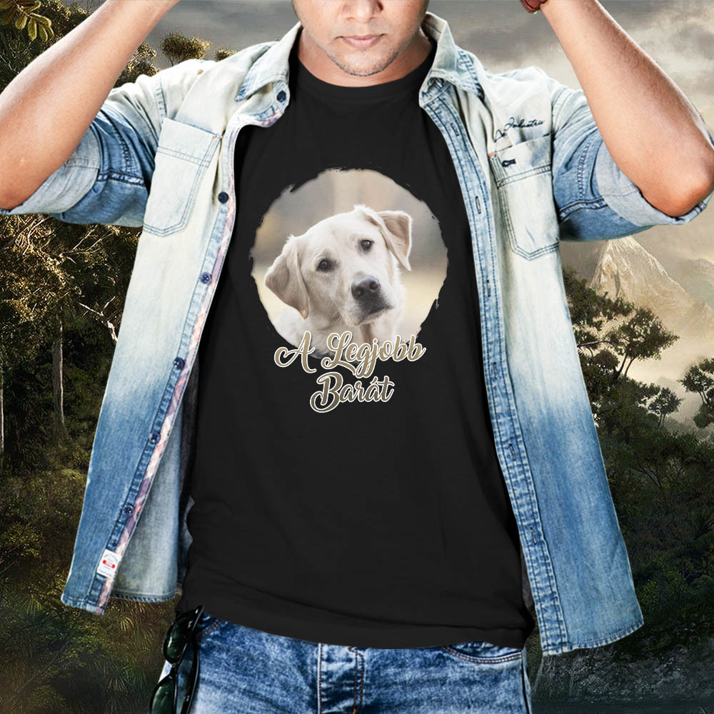 Fényképes kutyás póló, legjobb barát.  Egyedi, állatbarátoknak készült póló, amely tökéletes ajándék kutyatulajdonosoknak vagy bárkinek, aki szereti a hűséges négylábú társakat. A pólóra kerülhet házikedvenced képe vagy a kedvenc közös képetek is. „A Legjobb Barát” felirat kiemeli a kutyák hűségét és szeretetét, így ez a póló különleges ajándék lehet minden gazdi számára.