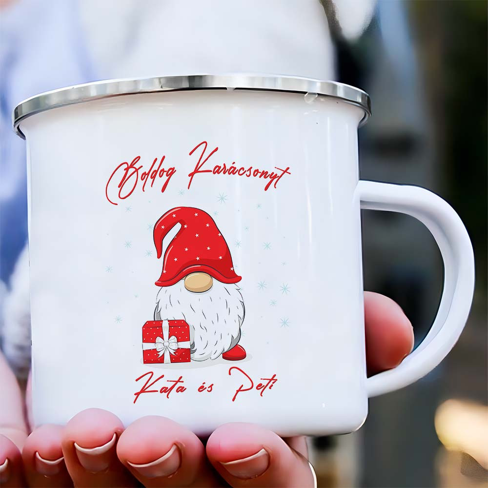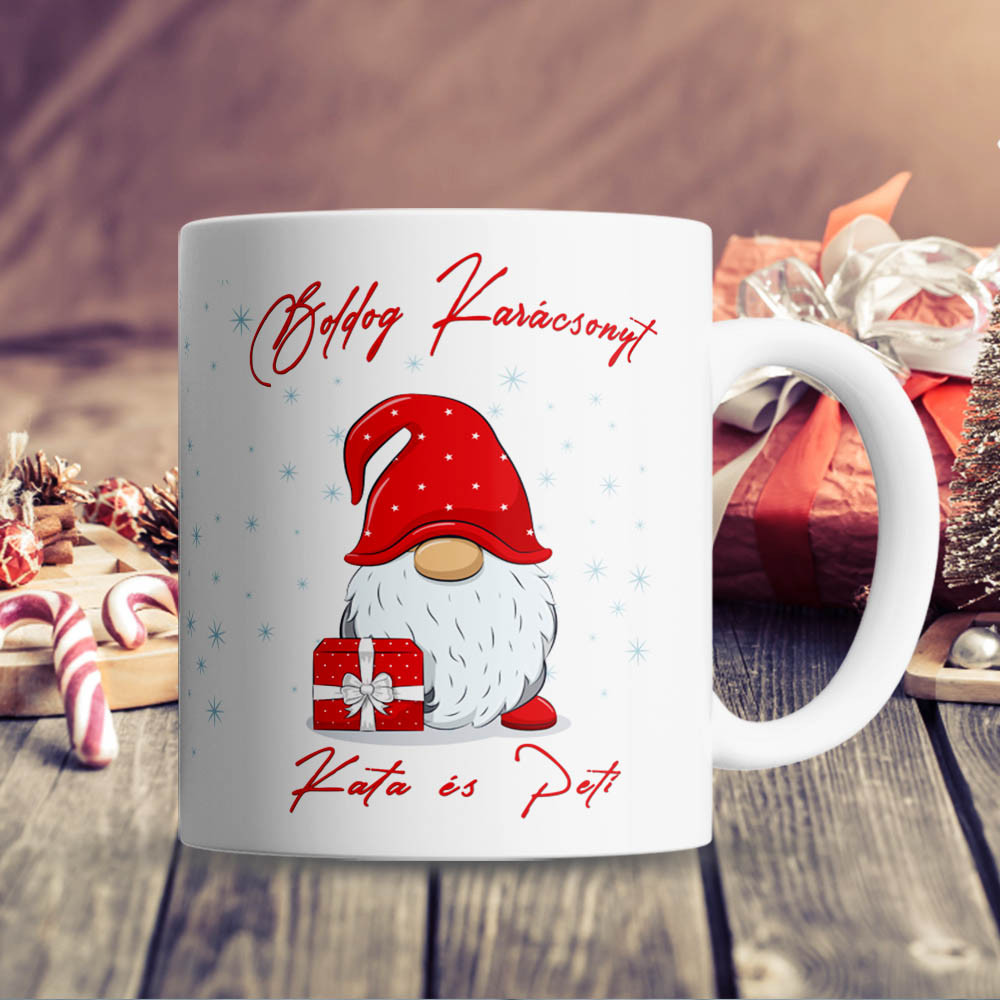 Neves manós bögre, karácsonyi ajándék. Gnome, manós mintával, saját neveddel, nevetekkel. Kérd díszdobozban, válassz bögre színt, kosárba helyezés előtt írd be a nevet, neveket és lepd meg szeretteidet, barátaidat egy szuper egyedi bögrével karácsonyra.