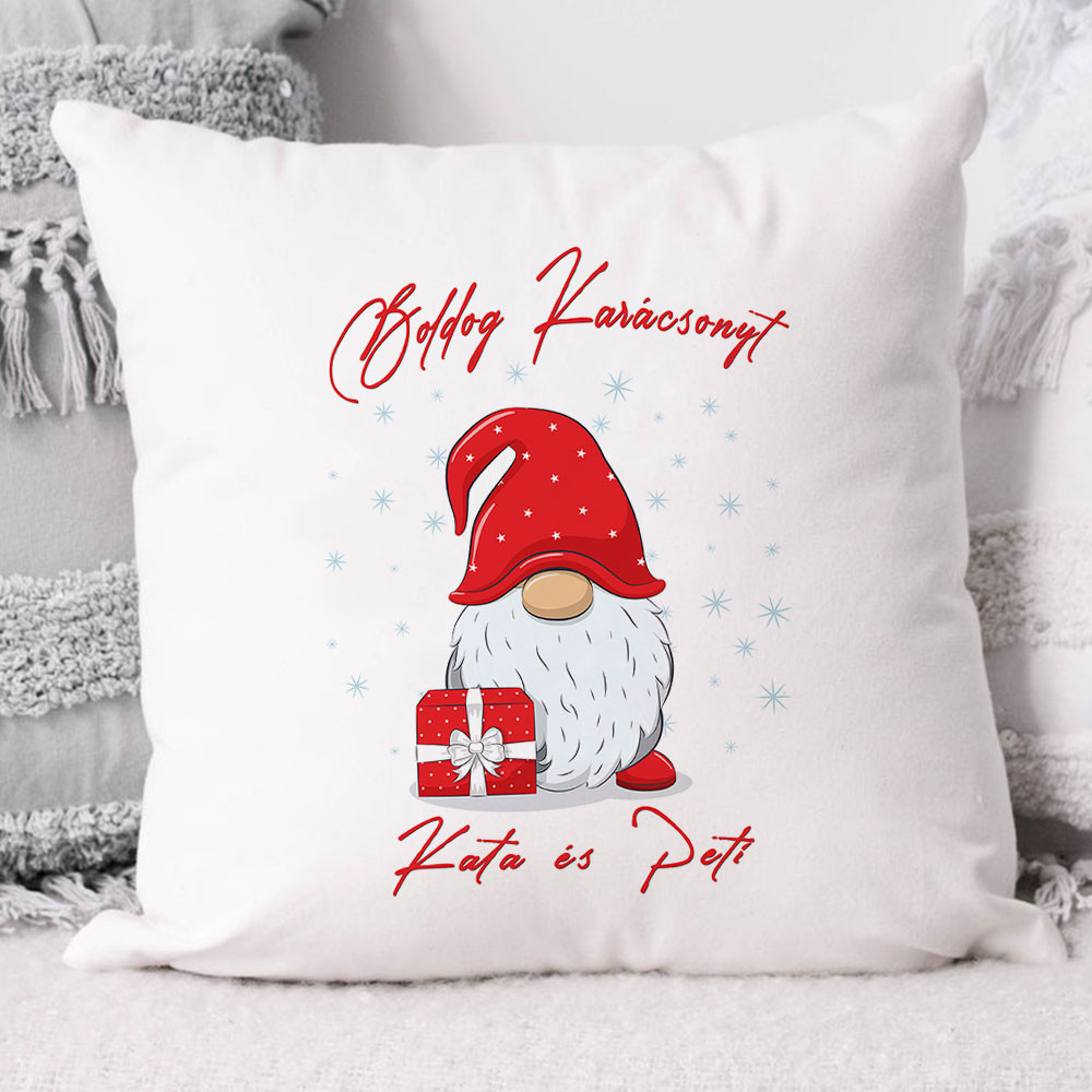 Neves manós párna, karácsonyi ajándék. Gnome, manós mintával, saját neveddel, nevetekkel. Kosárba helyezés előtt írd be a nevet, neveket és lepd meg szeretteidet, barátaidat egy szuper egyedi párnával karácsonyra. Tökéletes meglepetés nagyszülőknek, szülőknek, barátoknak. Többféle színben rendelhető, 40 x 40 cm méretű párna. A termék tartalmazza a nyomtatott huzatot, és a puha párnabélést is.
