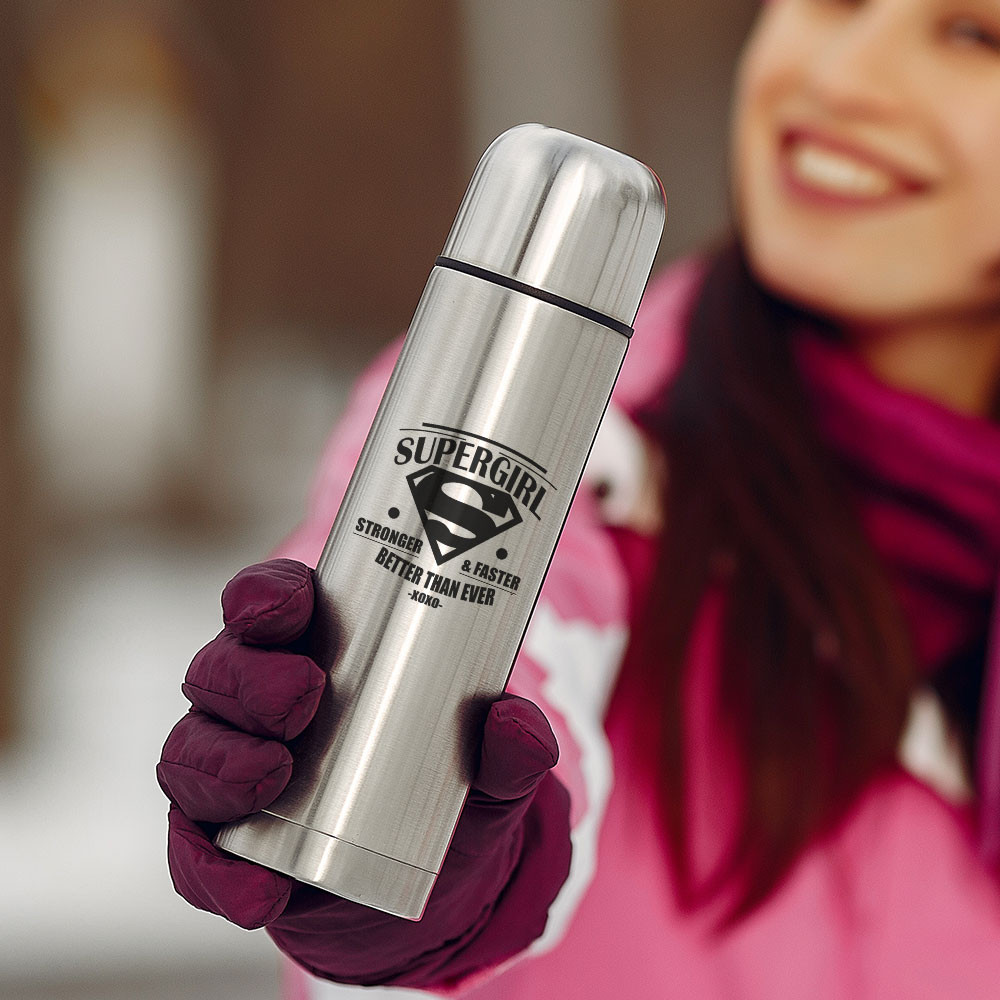 Termosz nyomtatás, Supergirl termosz. Erősebb, gyorsabb, jobb mint, valaha vagyis igazi szuper lány. Lepd meg egy igazi trendi termosszal barátnődet. Anyaga rozsda mentes acél és műanyag, 500ml-es és 750ml-es változatban elérhetőek.