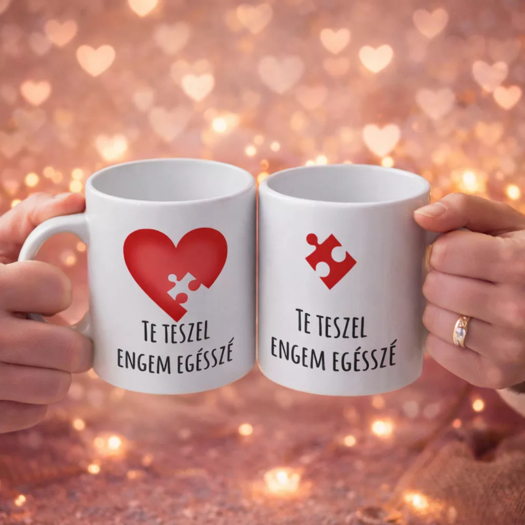Bögre valentin napra, te teszel egésszé. Bögre Valentin napra, házassági évfordulóra szerelmednek. Puzzle mintás bögre, pároknak akik csak együtt egy egészek. Ajándékozd meg szerelmed és magadat egy Te teszel engem egésszé feliratos páros bögrével, ami mindig veletek lehet, amikor nem vagytok együtt.