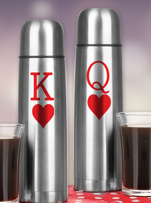 Páros termosz, Poker King és Queen. King és Queen páros termosz szett Valentin napra, évforduló, minden romantikus pillanatra. Poker kártya lapjainak mintájával készült termosz a tökéletes párosnak, ajándék minden szerelmesnek. Termosz mérete 500ml vagy 750ml.
