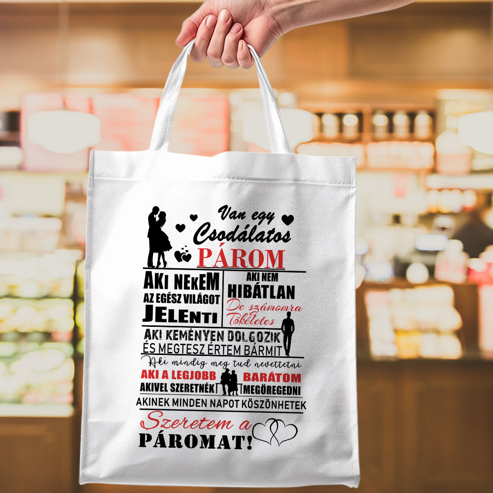 Van egy csodálatos párom vászontáska. Olyan ajándékot keresel amivel kifejezheted, mennyire szereted a párod? Ez a különleges, feliratos táska tökéletes választás szerelmeseknek évfordulóra, Valentin-napra, születésnapra vagy karácsonyra.