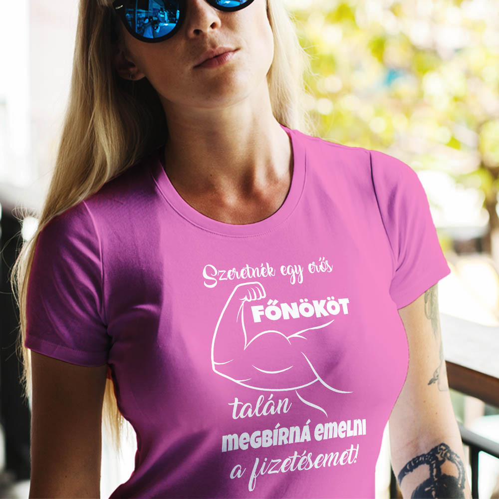 Ajándék főnöknek, vicces női póló főnöknek. Szeretnék egy erős főnököt, talán megbírná emelni a fizetésem, póló humoros célzással nőknek. Ajándék a főnökasszonynak születésnapjára, névnapjára kollégáktól.