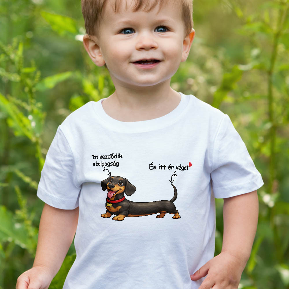 Tacsis gyerek póló, Ajándék kutyabarátoknak, Boldogság itt kezdődik. Ez a kedves és vidám tacsis gyerek póló garantáltan mosolyt csal a kisgyermekek és a kutyabarát családok arcára. A pólón látható aranyos tacskós minta és a humoros „Itt kezdődik a boldogság” felirat igazán különlegessé teszi ezt a darabot. Tökéletes választás mindennapi viseletre, óvodába, családi programokra vagy akár fotózáshoz is.